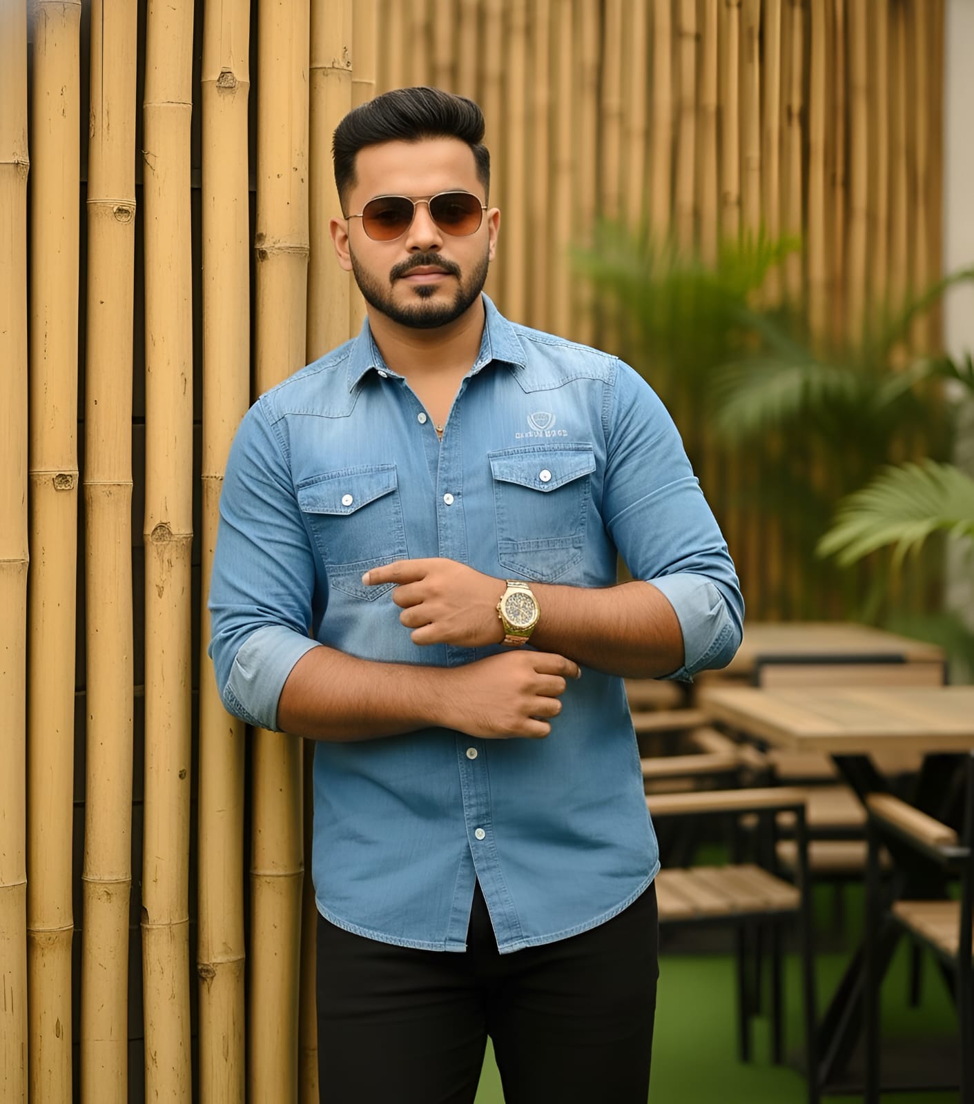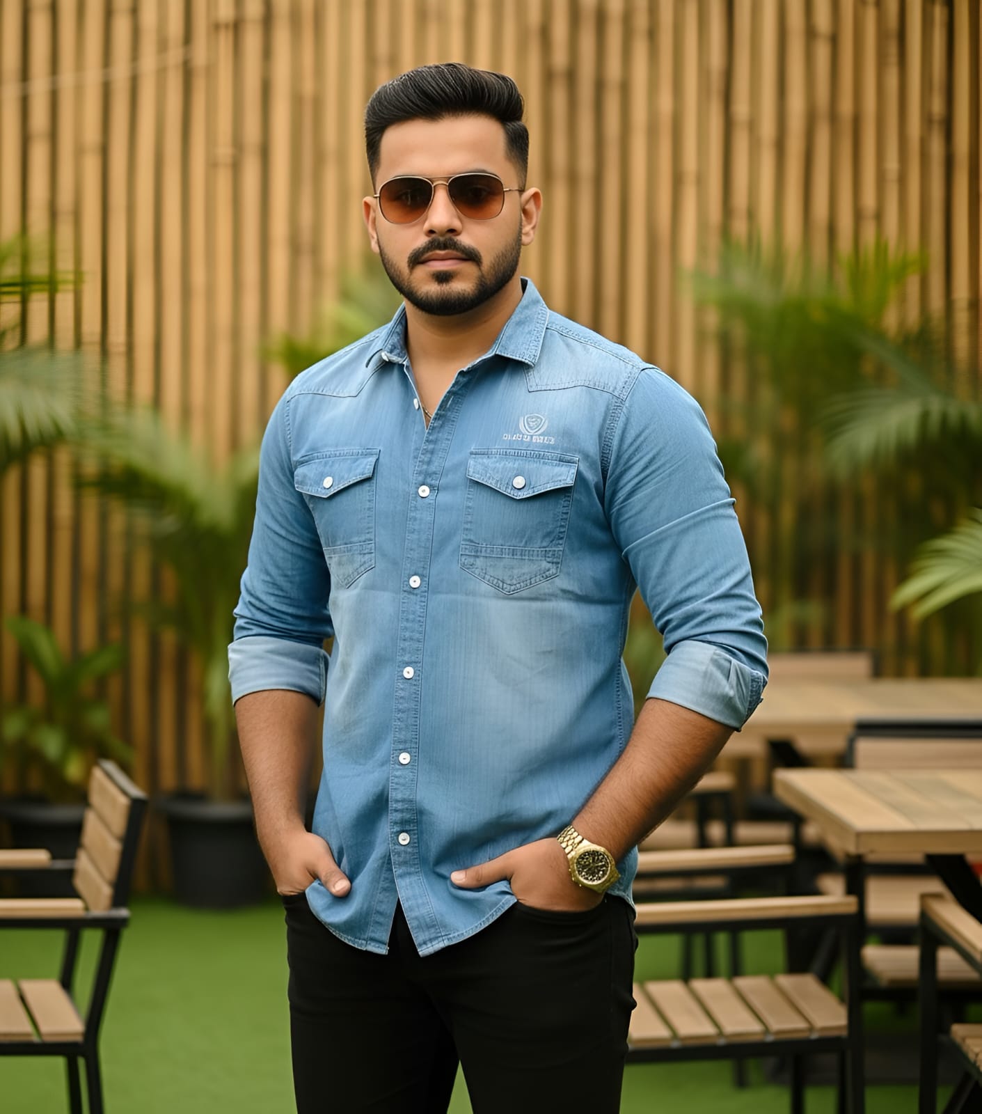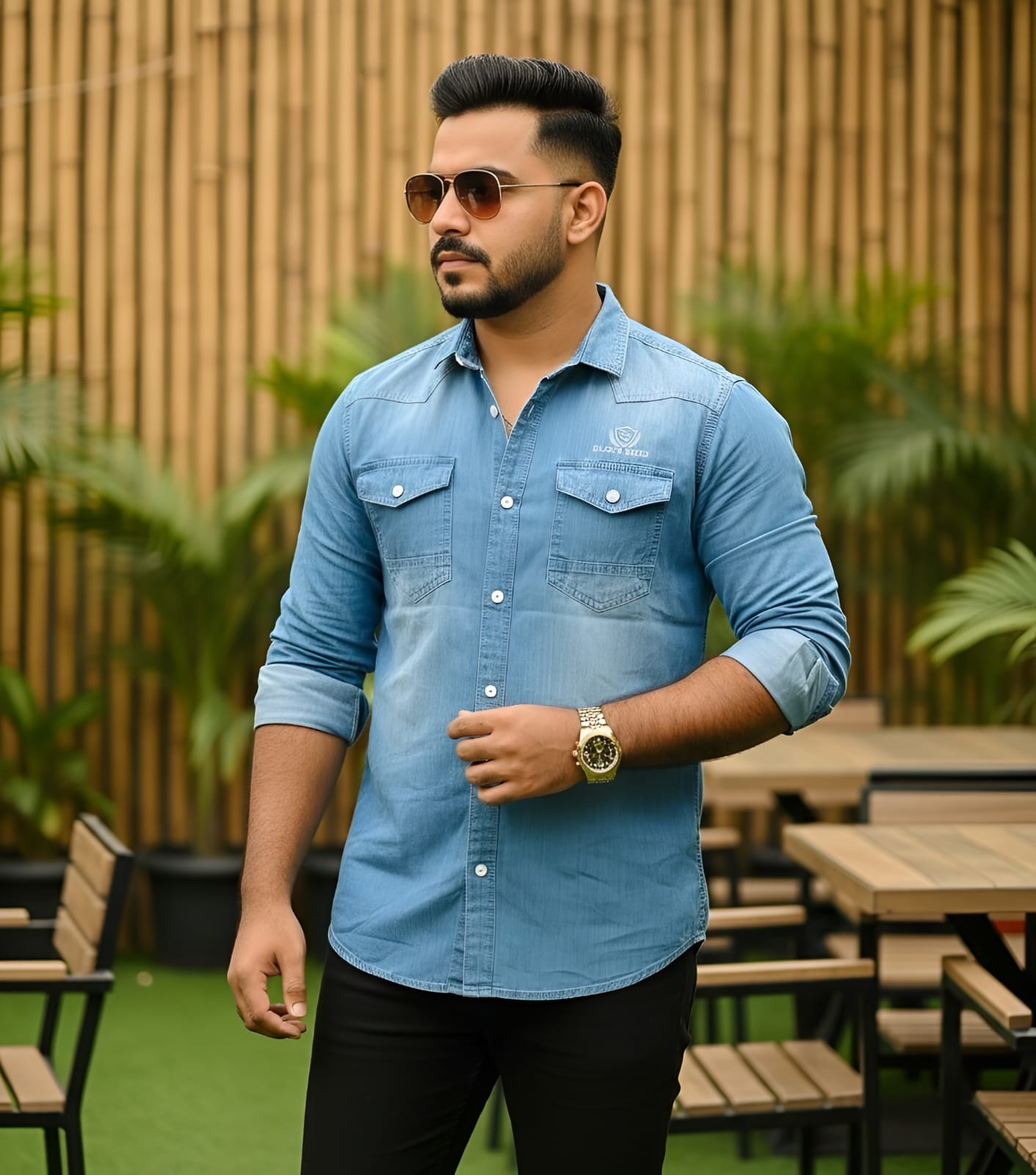 Pair this black denim shirt with chinos or jeans and a pair of sunglasses for a bold, confident look. Add a wristwatch for that extra edge.