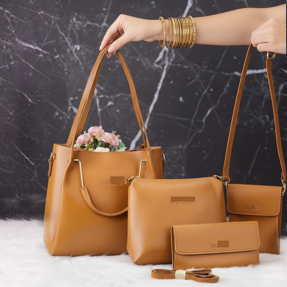 ৪টি ভিন্ন সাইজের ব্যাগ: একটি বড় টোট ব্যাগ, একটি মিডিয়াম সাইজের ব্যাগ, একটি স্টাইলিশ পার্স এবং একটি ছোট মোবাইল ব্যাগ। আপনার সব প্রয়োজন মেটাতে একটি পারফেক্ট কম্বো!